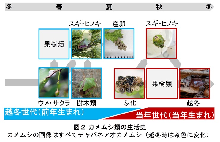 カメムシ類(図1)は、図2のような生活史(生まれてから次世代が生まれるまでのサイクル)を営んでおり、発生量が多い表年と少ない裏年が交互に起こると言われています。スギには夏から秋にかけて飛来し、球果表面から種子に向けて口針を挿し込み、種子内部に達すると吸汁します。このとき、吸汁された種子は発芽能力を失います。森林林業技術センターでは、スギの種子を生産しており、発芽能力を失った種子が増えると安定供給に支障が生じます。実際、平成30年頃からそのような種子が増えてきており、カメムシ類による吸汁が一因ではないかと考えられました。しかし、彼らがどこから、いつ、どれくらいスギに来て、どの程度被害を与えているのかは十分にわかっていません。