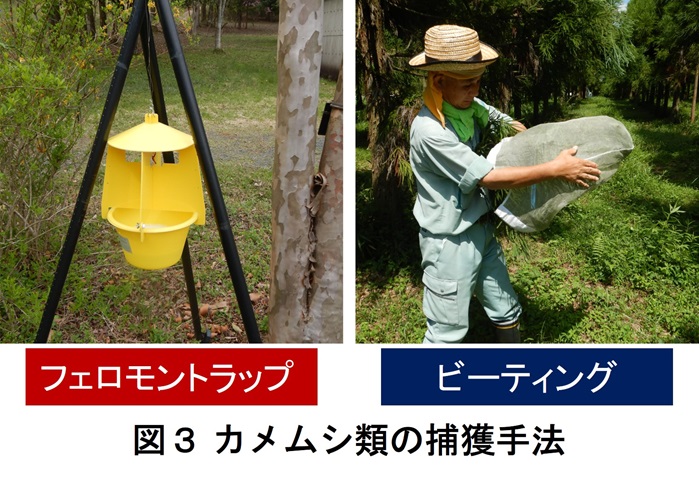 そこで、これらを明らかにするため、令和3年度から緑化センター少花粉スギ採種園(朝来市山東町)において、定点モニタリングを行っています。カメムシ類の発生パターンの把握のため、集合フェロモンにより成虫を呼び寄せる「フェロモントラップ」と枝葉にいる成虫と幼虫を振り落とす「ビーティング」の2つの手法(図3)でカメムシ類を捕獲し、種毎の個体数計測を行いました。また、被害把握のため、5月から袋で覆いカメムシ類から吸汁されにくくした「袋あり区」と、何もせず吸汁し放題の「袋なし区」を設定し、両区の発芽率及び、カメムシ類の吸汁した痕跡である口針鞘の有無を調査しました。
