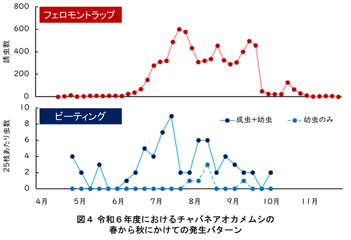 令和6年の定点モニタリングでは、チャバネアオカメムシ、クサギカメムシ、ツヤアオカメムシの3種類が捕獲されました。フェロモントラップでは、春から秋にかけて3種計8,179匹が捕獲され、うち9割がチャバネアオカメムシでした。優占種であったチャバネアオカメムシに注目すると、フェロモントラップ(図4上段)への飛来ピークは、越冬世代(前年生まれ)が7月、当年世代(当年生まれ)が8~9月と推定されました。ビーティング(図4下段)では、5月上旬から成虫、7月下旬から幼虫が捕獲されました。このことから、フェロモントラップで確認された8~9月の飛来ピークは主に当年世代(当年生まれ)であることが示唆されました。