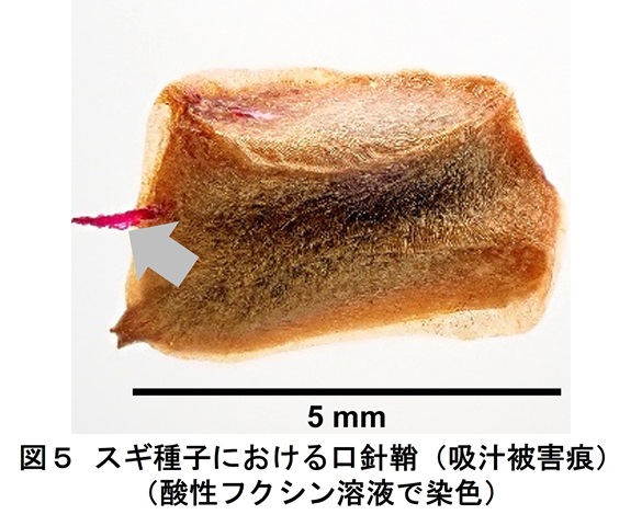 また、カメムシ類の吸汁した痕跡である口針鞘は「袋なし区」のみでみられ、約半数の種子でみられました(図5)。発芽率は、「袋あり区」では44%とスギの平均(26%)を上回りましたが、「袋なし区」では7%にとどまり、カメムシ類の吸汁により発芽率が約8割低下することが明らかになりました。